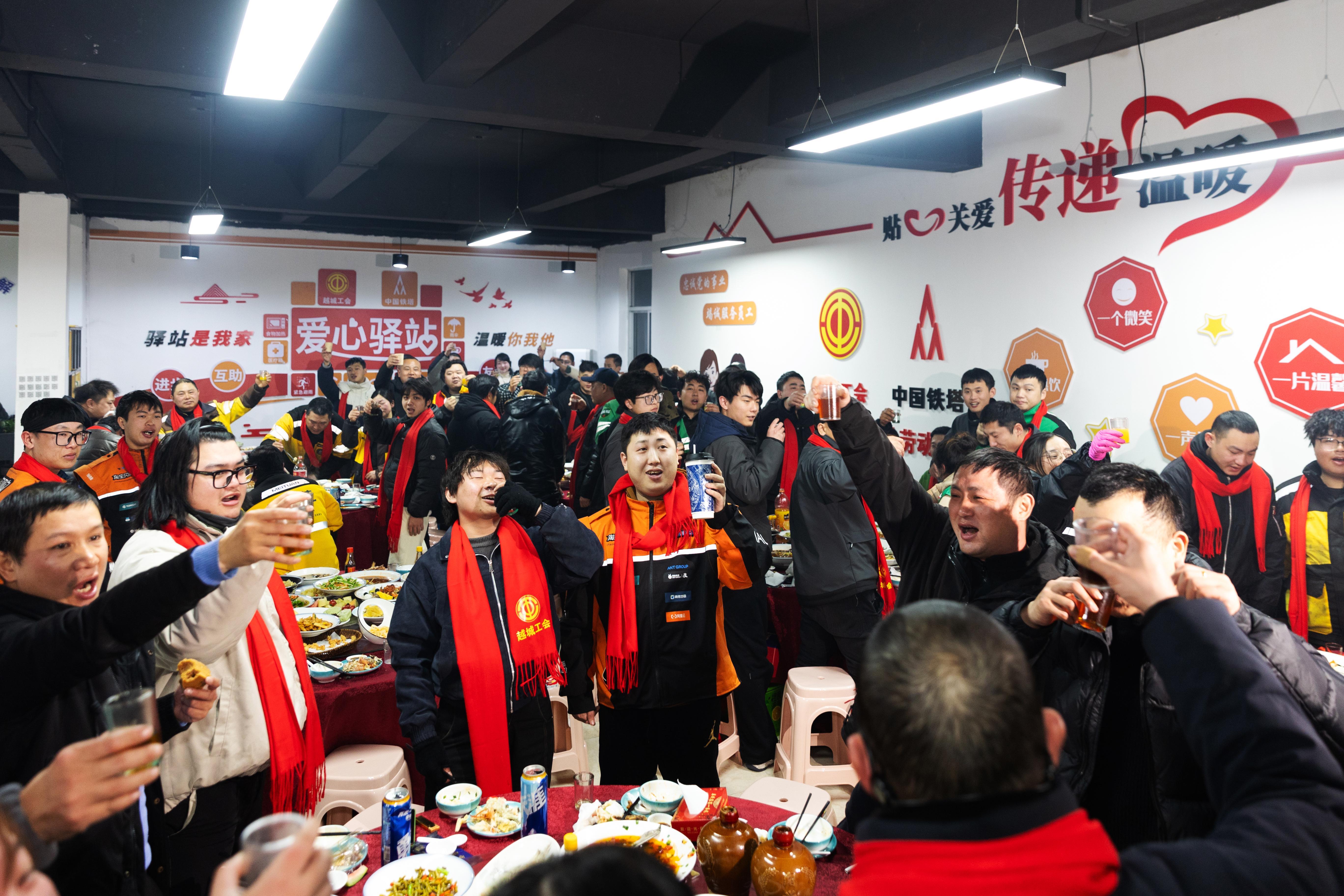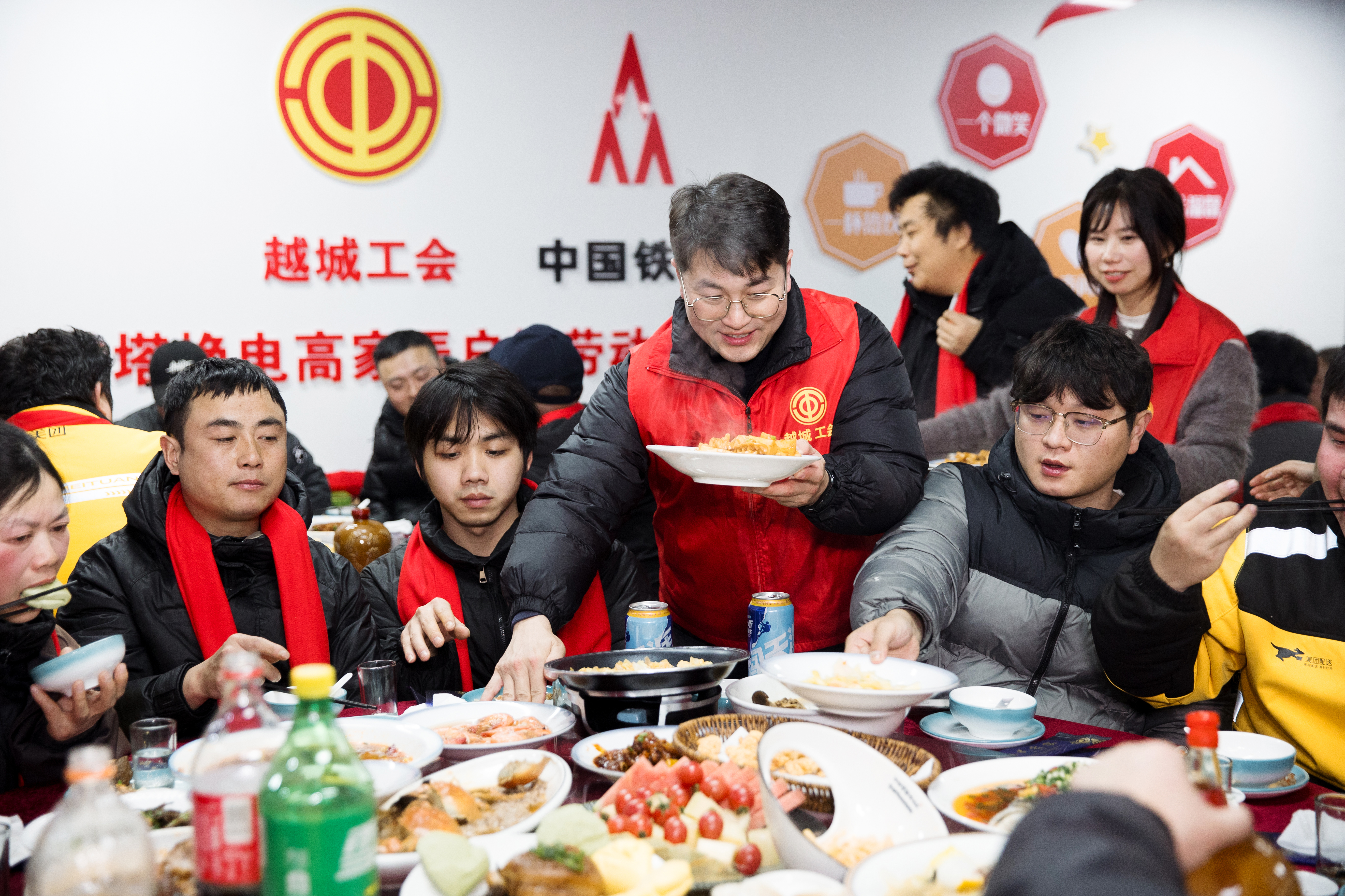 小年至,年味浓。2月10日晚,淅淅沥沥的小雨为越城区添了几分冬日的凉意,而高家弄铁塔换电小哥驿站户外劳动者服务站点内却暖意融融。由越城区总工会、中国铁塔绍兴分公司主办,越城区外卖行业联合工会承办的“感恩有你 温暖同行”2026年越城区外卖骑手新春暖心年夜饭活动在此温情启幕,近80名外卖骑手欢聚一堂,共赴这场专属的新春盛宴,在小年佳节感受来自工会的暖心关怀。
