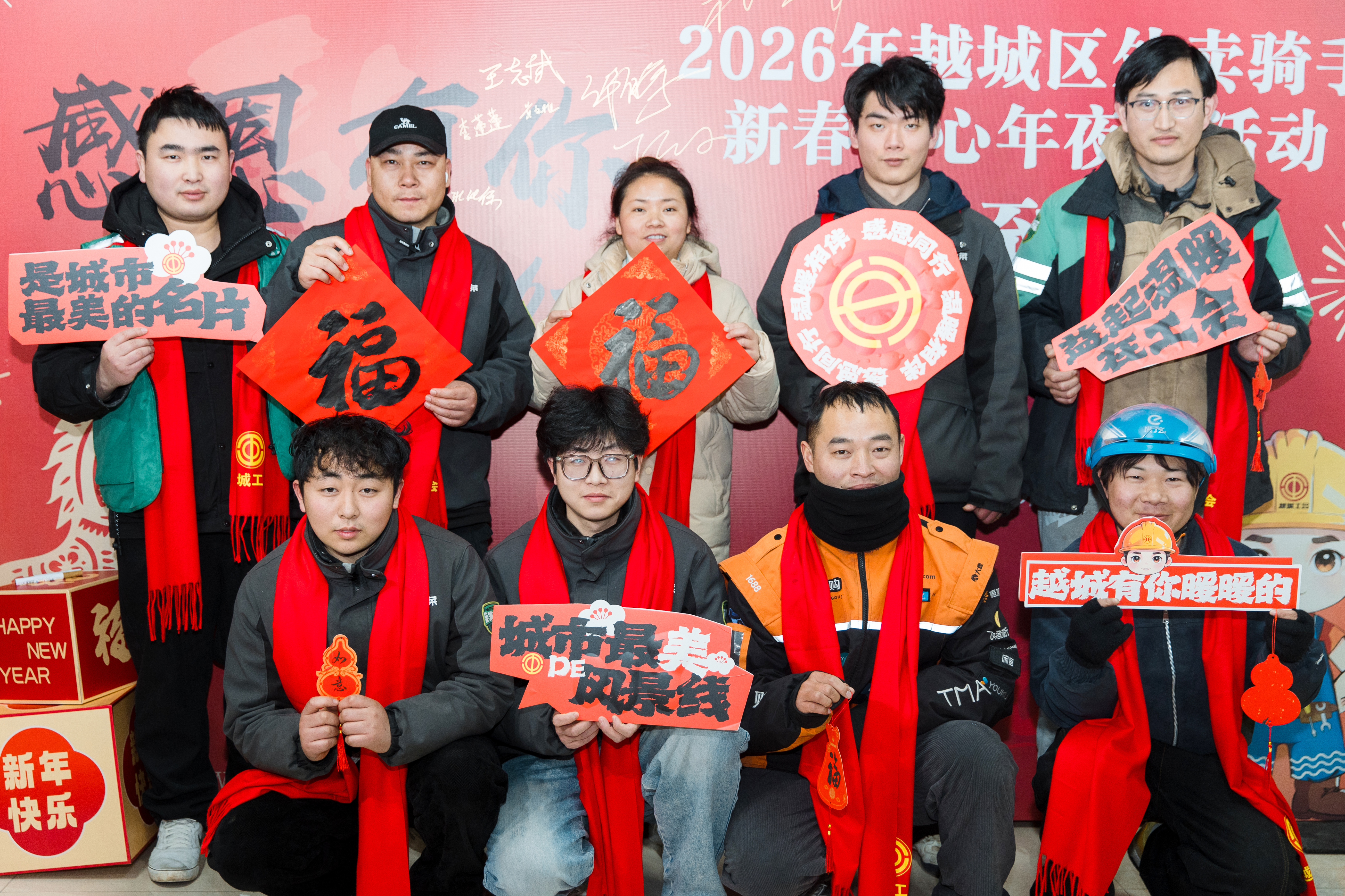 每当一位骑手到来,工会志愿者们便会为他戴上精心准备的大红围巾、递上满载祝福的春联、福卡和暖冬年货大礼包,把新春的祝福与“家”的温暖,实实在在送到留越在岗外卖小哥的心坎上。骑手们在主题墙前签名合影留念,定格下这份属于“新家人”的团圆瞬间。